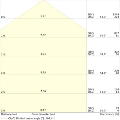De gradenbundel geeft informatie over hoe breed het licht wordt uitgestraald. Dit zit tussen de 0 en 360 graden (D). Hoe kleiner de hoek, hoe specifieker de lichtbundel is. Over het algemeen is een smalle gradenbundel perfect voor sfeer- of accentverlichting, terwijl een brede gradenbundel ideaal is om grote oppervlaktes te verlichten.